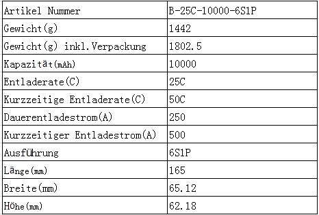Bestell-Nr.:B-25/50C-10000-6S1P Spec. Gens ace Lipo 10000mAh 6S1P 25C/50C Batterie sind für die folgenden Modelle geeignet. Strenge Selektierung und Qualitätskontrolle in der Fertigung garantieren niedregen lnnen Widerstand/hohe Kapazität und eine hohe Spannungslage für maximale Leistung ihres Antriebs und lange Lebensdauer. Bei unseren Softcase Lipos setzten wir hochwertige Oracover Folie ein,die Kombination mit einer eingearbeiteten Aluminiumplatte ist momentan einmalig auf dem Markt.Ihr Lipo wird damit noch mehr durch mechanische Einflüsse geschützt. Unsere C-Angaben können 20-90% geringer sein als bei anderen Marken.Sie werden feststellen,dass Gens Ace Akku regelmäßig besser abschneiden als andere Marke mit 'höher bewertete C-Raten.Gens Ace Lipo Pack werden immer mit der tatsächlichen Ratings C beworkben - verygleichen Sie unsere