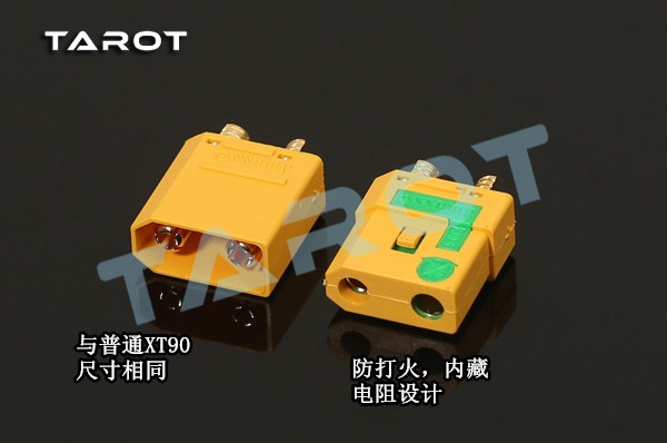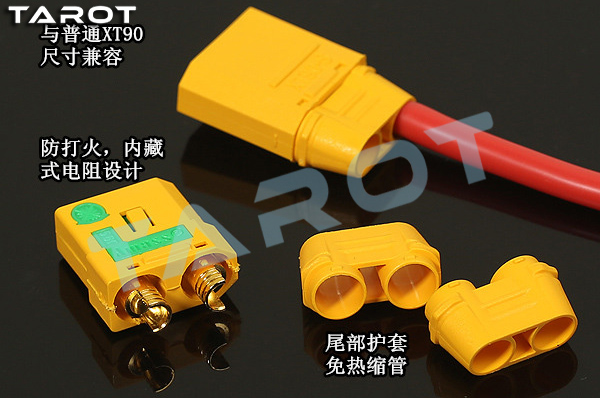 使用時兩級插入,第一級插入接通電阻,以防止火花。第二級插入屏蔽電阻,正常通電,XT90-S插頭的可以耐電流90A(持續(xù))、120A(峰值)XT90采用4.5mm香蕉插頭。