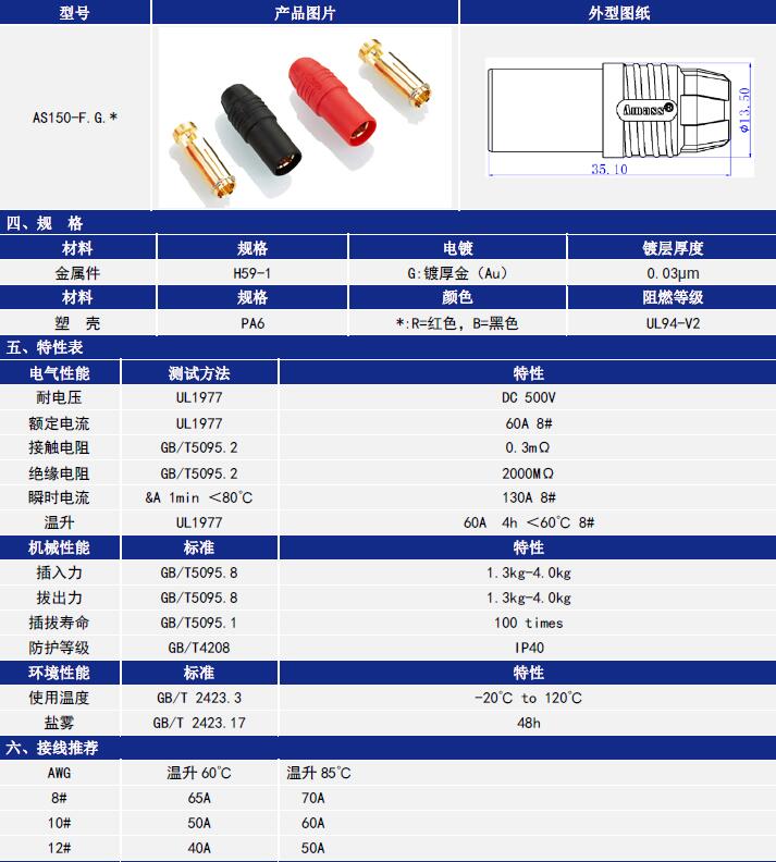 AS150防火花插頭適用于高電壓電池,具有獨(dú)特的防打火/防反插設(shè)計以及耐大電流性能。采用超大規(guī)格7mm低阻抗鍍真金香蕉插頭。并且在公插頭內(nèi)嵌入了電阻防止產(chǎn)生火花。具有整體重量輕、體積小,拔插手感好等優(yōu)點(diǎn)。