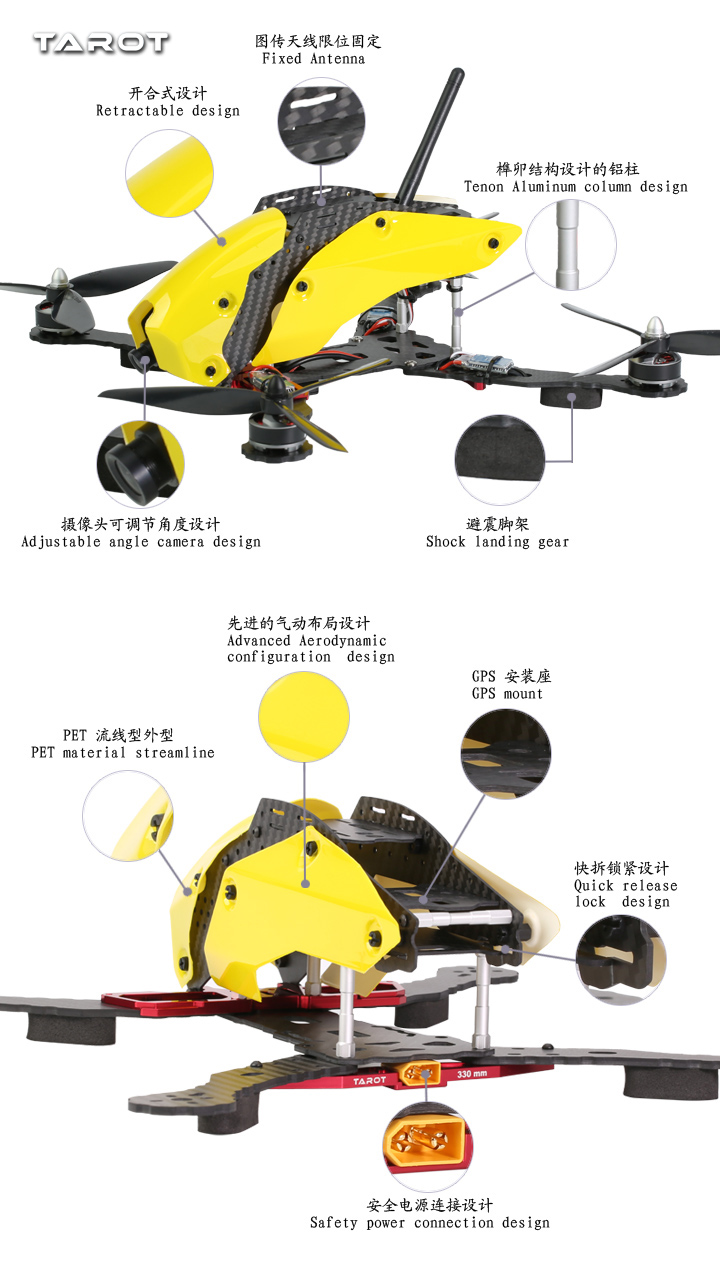 多種顏色的PET靈動(dòng)外殼奪人眼球,上蓋開合式設(shè)計(jì),讓維修變的更加便捷。Tarot強(qiáng)大的金屬CNC加工能力,讓所有的連接點(diǎn)均采用了榫卯架構(gòu)設(shè)計(jì)?勺杂烧{(diào)節(jié)攝像頭角度、快拆鎖緊設(shè)計(jì)、天線限位,整機(jī)輕量化等眾多巧思妙想,都可以在這臺穿越機(jī)上尋獲。