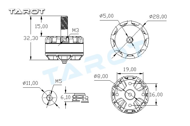 Tarot MT2205Ⅱ-2300KV風扇型無刷馬達適用180/190/200/220等各款多軸穿越機。MT2205無刷馬達重心極低,采用0.20mm超薄高效率矽鋼片,(軸原生槳夾結(jié)構(gòu))使其同心度可以得到最佳的保證。風扇型電機上蓋具有高效率的主動散墊設計,以獲得更低的工作溫度意味著更高的工作效率。