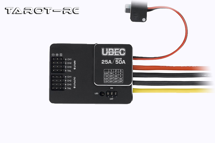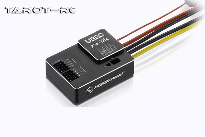 好盈出廠的UBEC-25A(3-18S)外置式BEC。UBEC是一種外置式直流穩(wěn)壓裝置,它以開關(guān)穩(wěn)壓電源的模式工作。本UBEC可以從3-18S鋰電池組獲得適合接收機(jī)和其它設(shè)備工作的直流電壓,并穩(wěn)定地提供高達(dá)25A的輸出電流。該UBEC可以輕松地為遙控模型上的各種設(shè)備供電,尤其適合使用多個(gè)舵機(jī)的大型直升機(jī)或大型固定翼飛機(jī)使用。